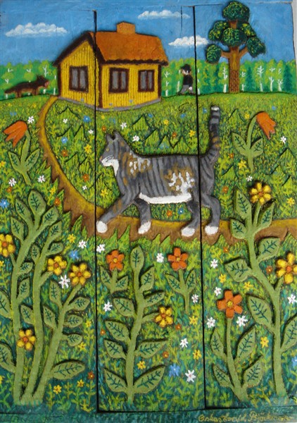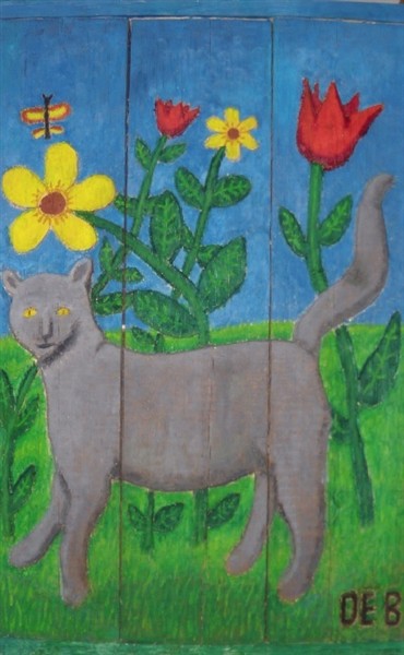 Grå katt på blomsteräng